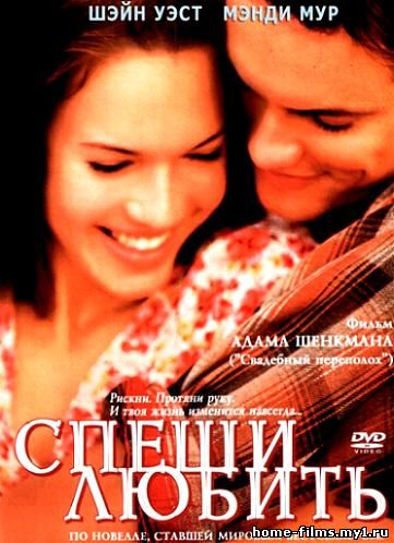 Название: Поспішай кохати / Спеши любить (2002) Год выхода: 2002 Жанр: Драми, Мелодрами Країна:США Режиссер: Адам Шенкман Актори: Шейн Уест, Менді Мур, Пітер Койот, Деріл Ханна, Лорен Джерман, Клейн Кроуфорд, Аль Томпсон, Пас де ла Уерта, Джонатан Паркс Джордан, Метт Лутс Кумир своєї школи, незалежний, красивий і жорстокий з ізгоями, хлопець на ім'я Лендон Картер. Звичайно, він не міг помічати непоказну, що думає тільки про навчання, Джеймі. Після чергової виконану безглуздої витівки, Картера змушують займатися зі студентами й грати в шкільній п'єсі. Але все це не для нього, і він просить про допомогу скромницю відмінницю Джеймі, яка погоджується допомогти Лендону, але тільки якщо він пообіцяє їй, що не буде закохуватися в неї. Самовпевнений хлопець з радістю погоджується і охоче дає клятву, але незабаром він розуміє, що зробив дурість і клятву стримати буде дуже непросто ...